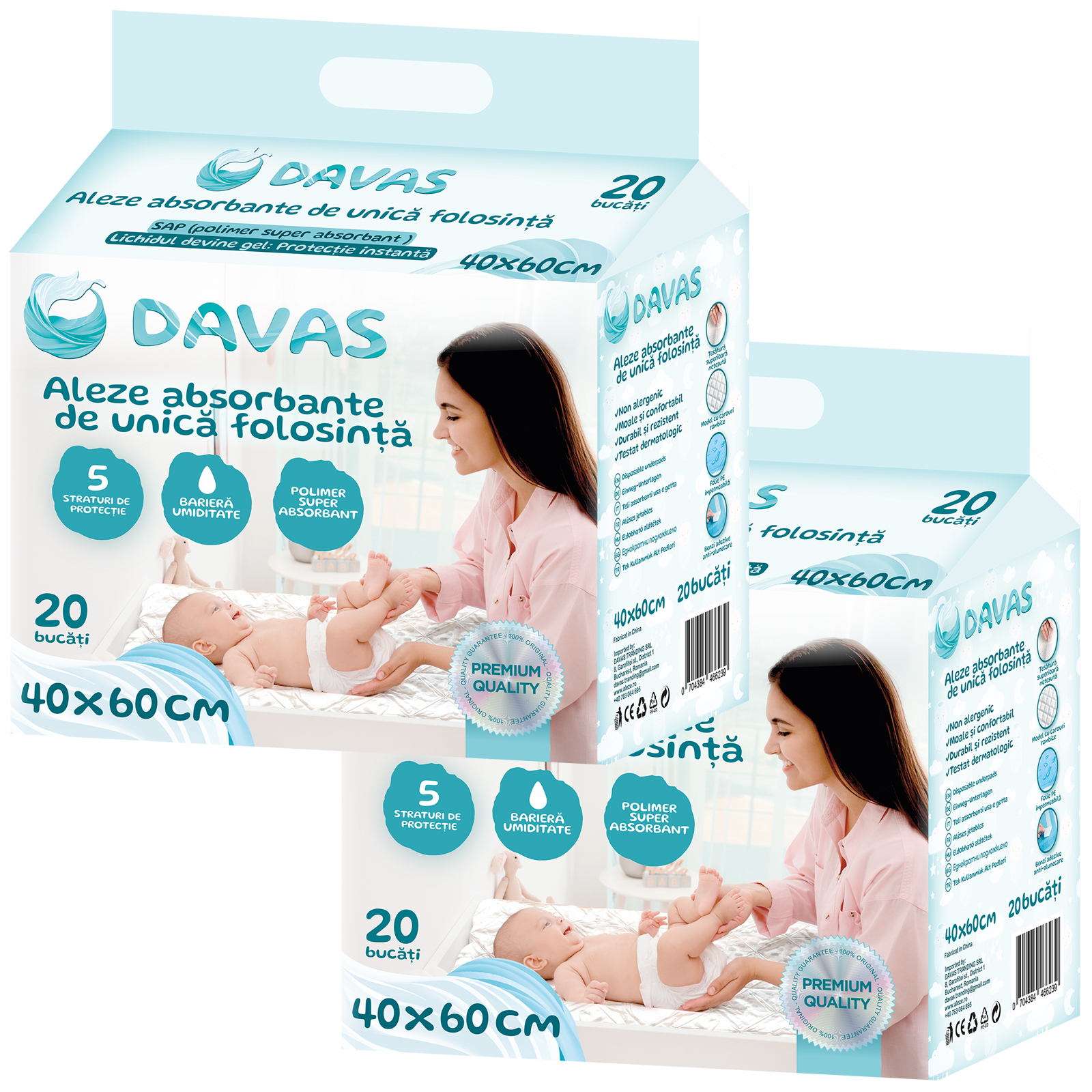ALEZE DAVAS, 40x60 CM, 40 BUC, ABSORBANTE, UNICA FOLOSINTA, 5 STRATURI, CU POLYMER SAP, BENZI ADEZIVE