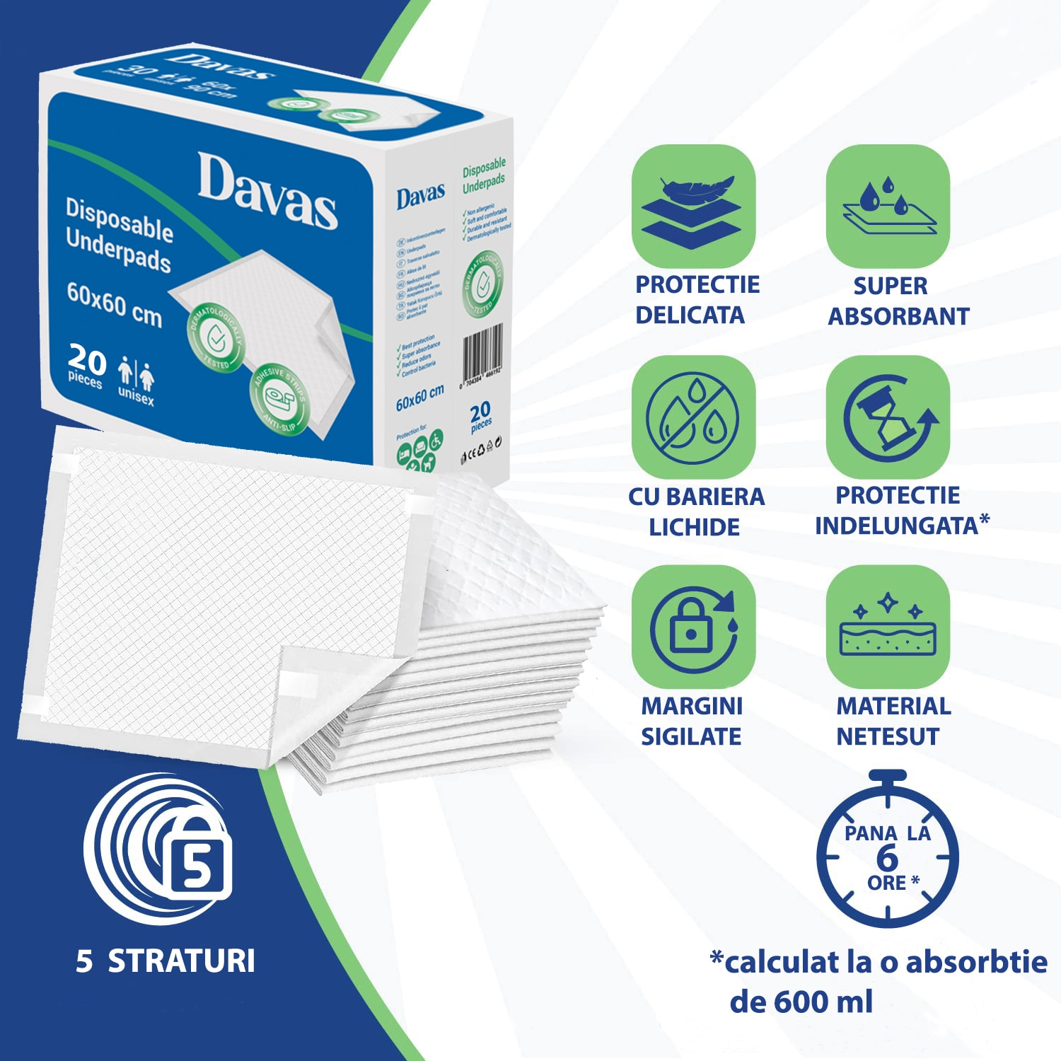 ALEZE PROTECTIE PAT DAVAS, ABSORBANTE, 60x60 CM, 240 BUC., UNICA FOLOSINTA